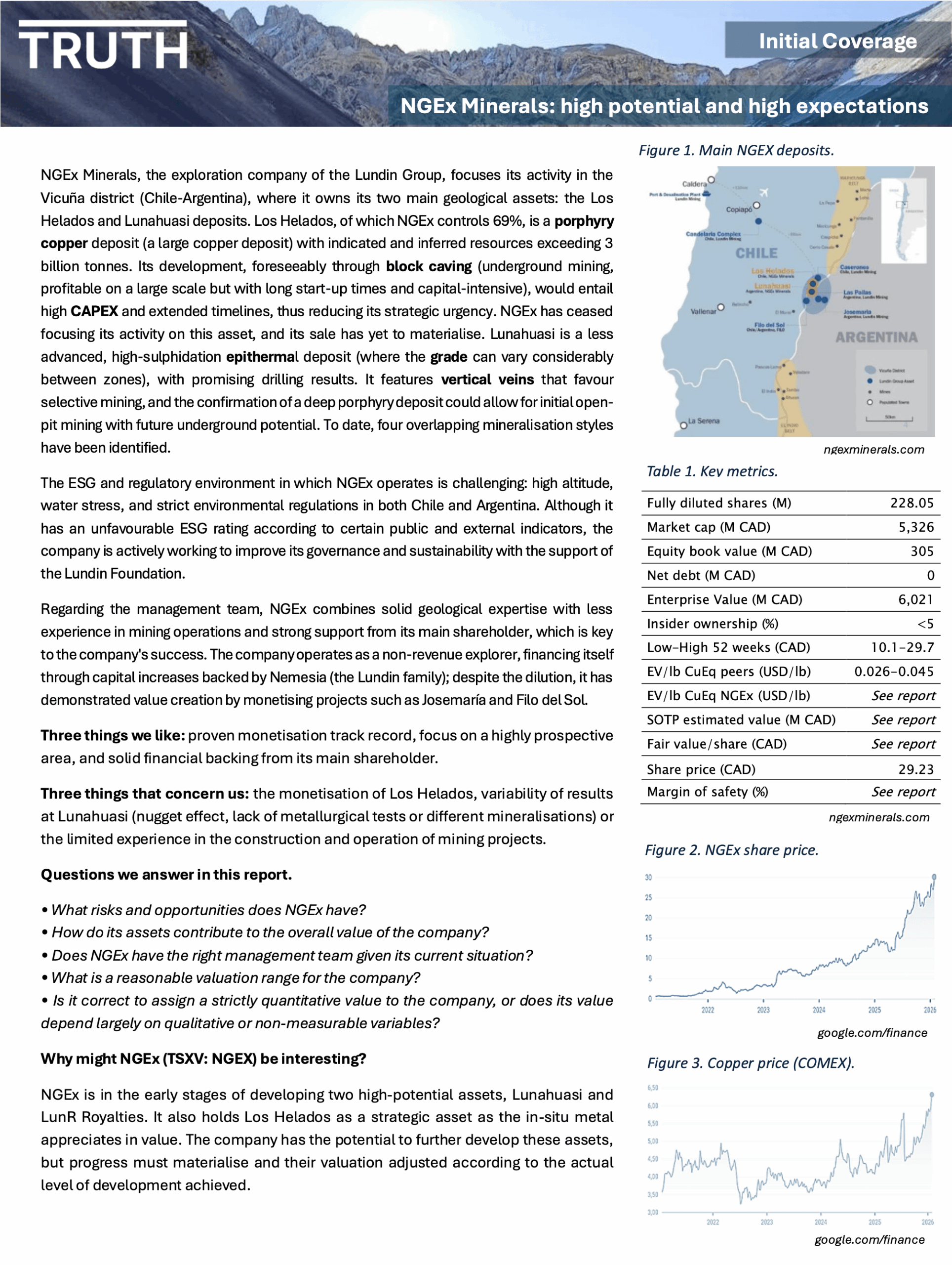 The TBG team has studied NGEx Minerals from multiple disciplines (geology, mining, metallurgy, ESG, management team and finance) to offer a holistic, neutral and objective view, considering both the risks and opportunities that the company faces.